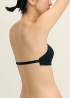 3Dカップ内の脇で上辺と下辺をV字でつなぎ、バックテープで左右のカップを互いに引っ張り合って身体の動きにフィットし、肩紐なしでもズレにくい構造です。テープはアジャスターで調節可能。