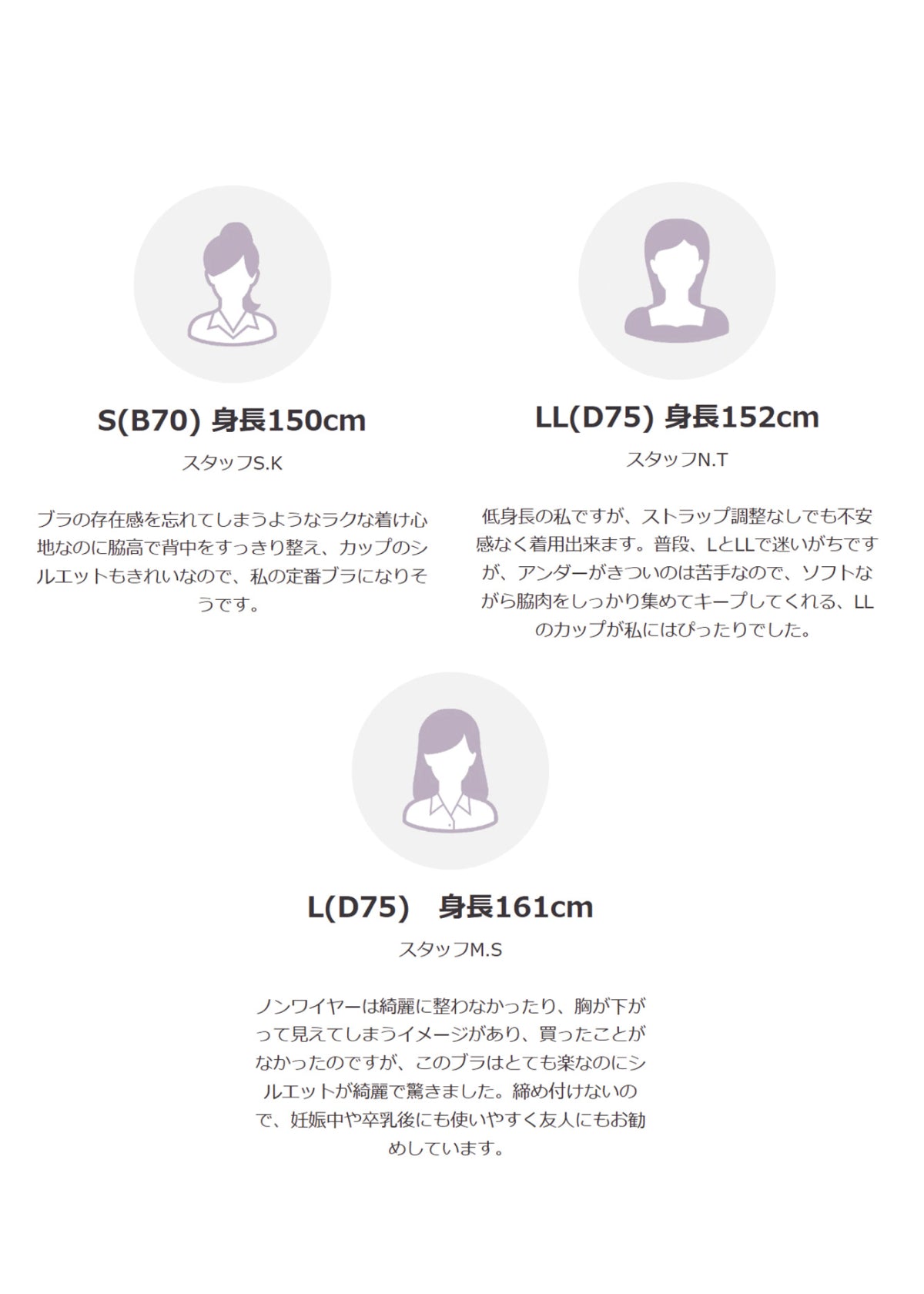 女性のカラダは年齢やホルモンバランスで日々変化します。このブラは、月経周期や妊娠初期、授乳期、卒乳期など、バストの微妙な変化にもしなやかにフィットする設計。サイドまでの立体設計によってフィット感が持続するため、一日中ズレや違和感なく過ごせます。