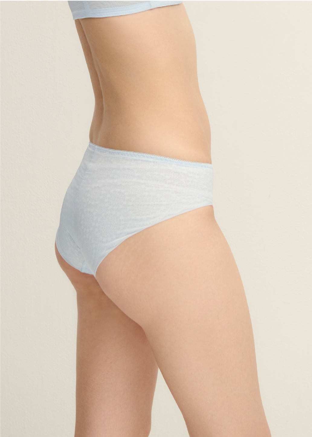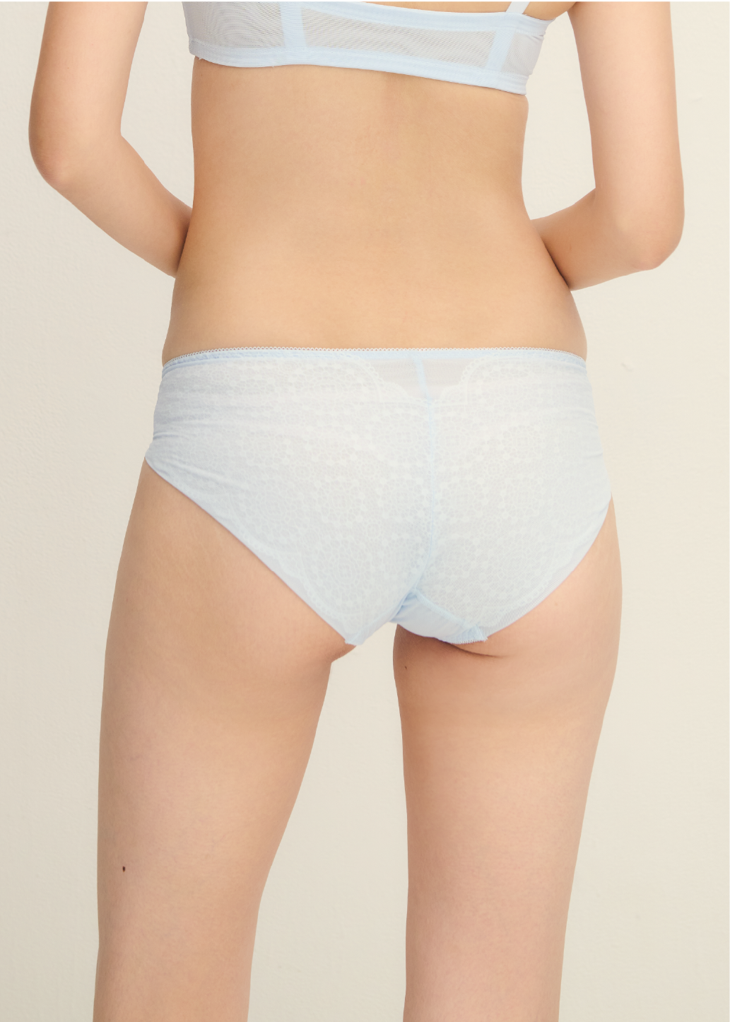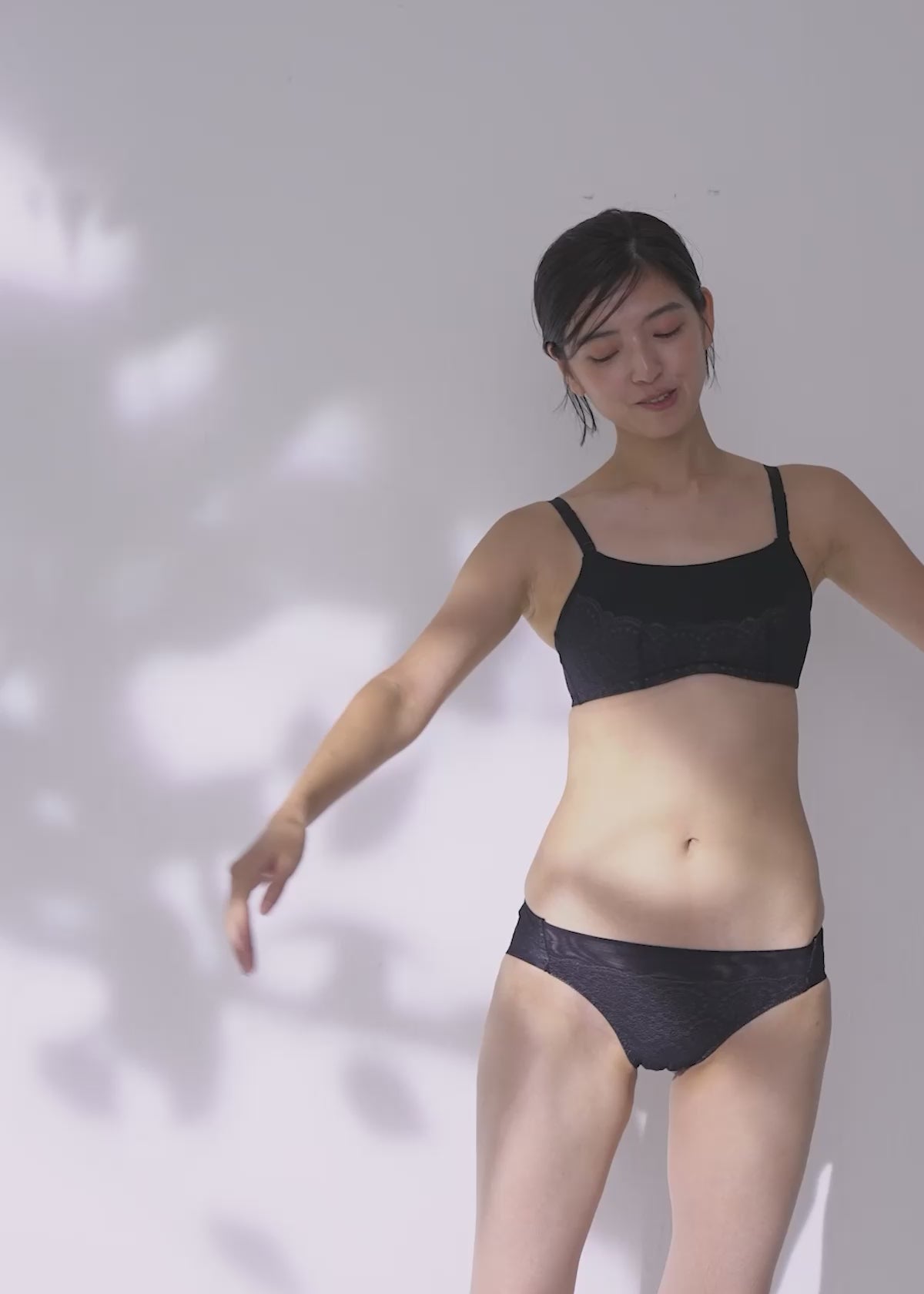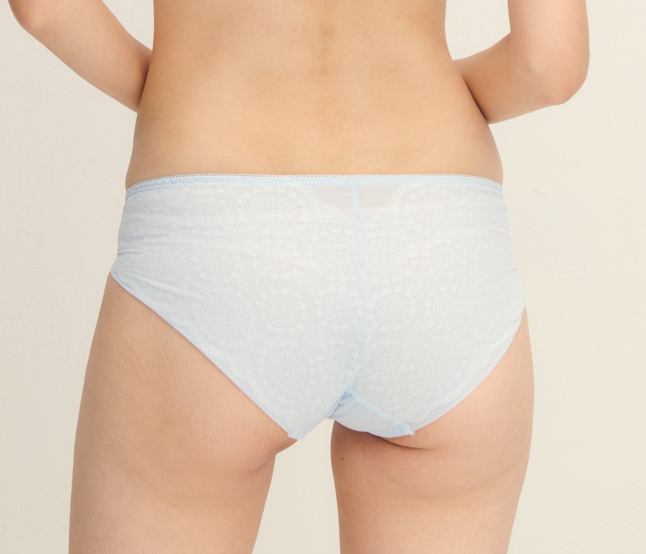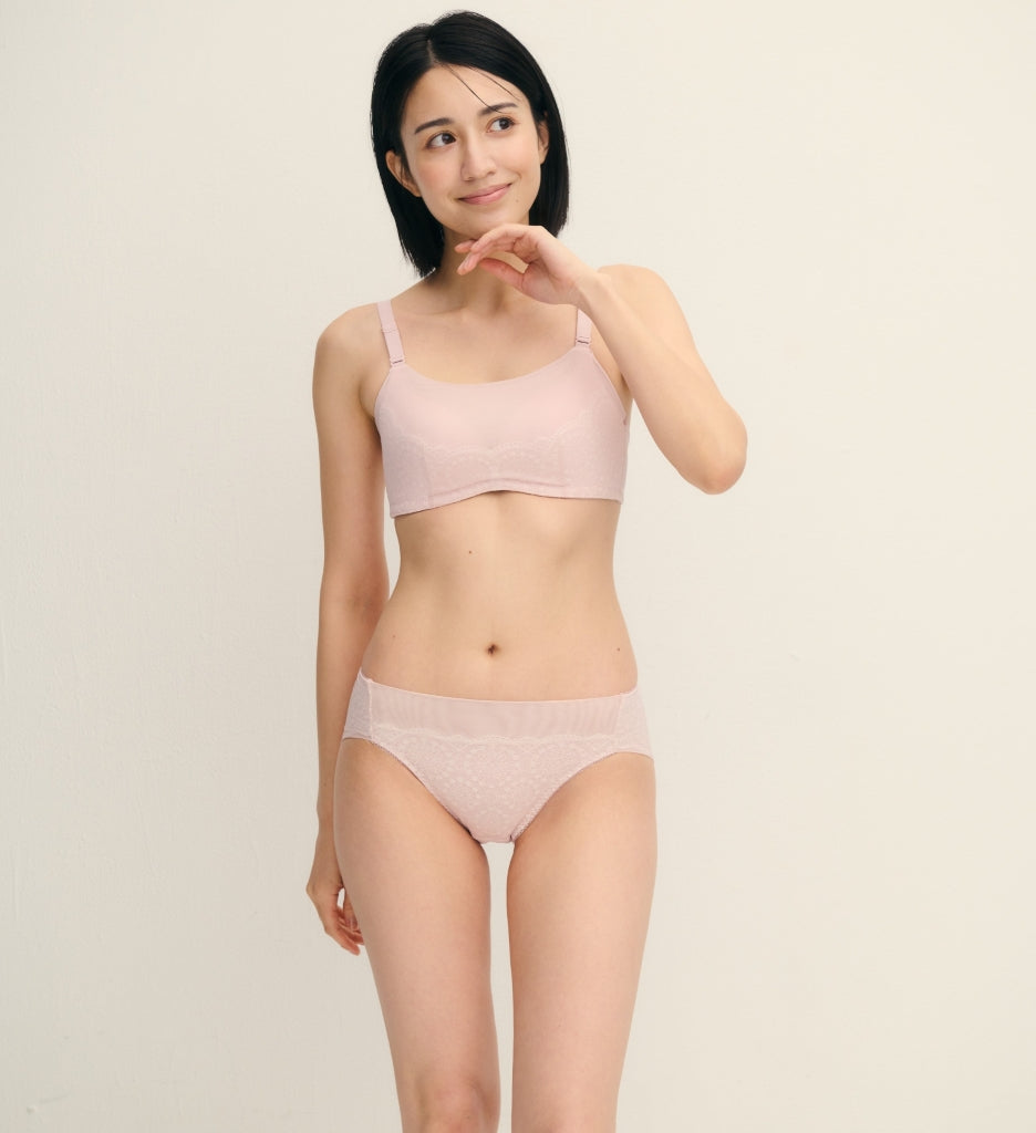 ブラ同様にレースをパワーネットの内側に挟み込み肌に直接触れず、凹凸を抑えた設計に。薄手の服やフィット感のあるボトムスでもラインが目立ちにくく、日常使いにも取り入れやすい。