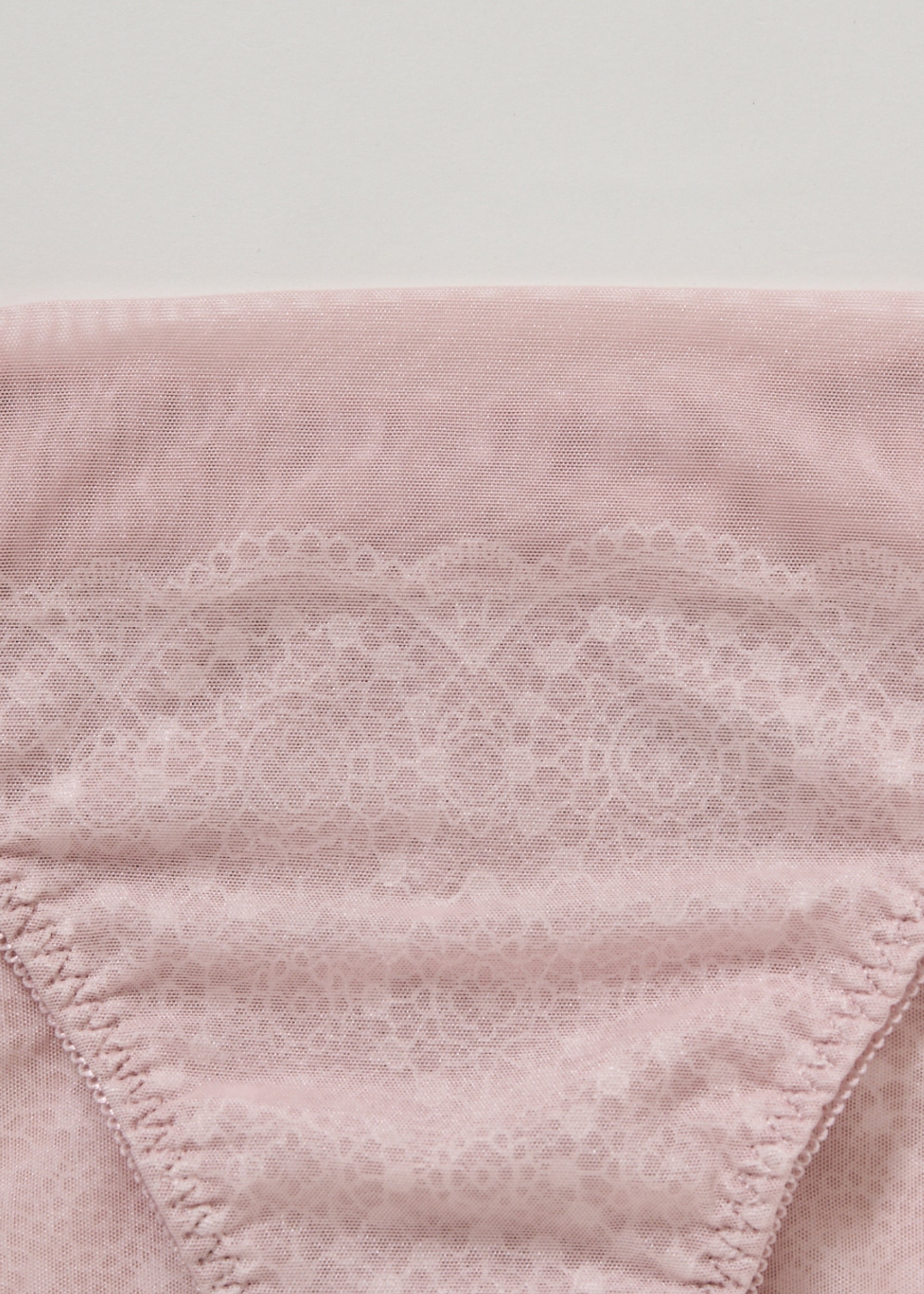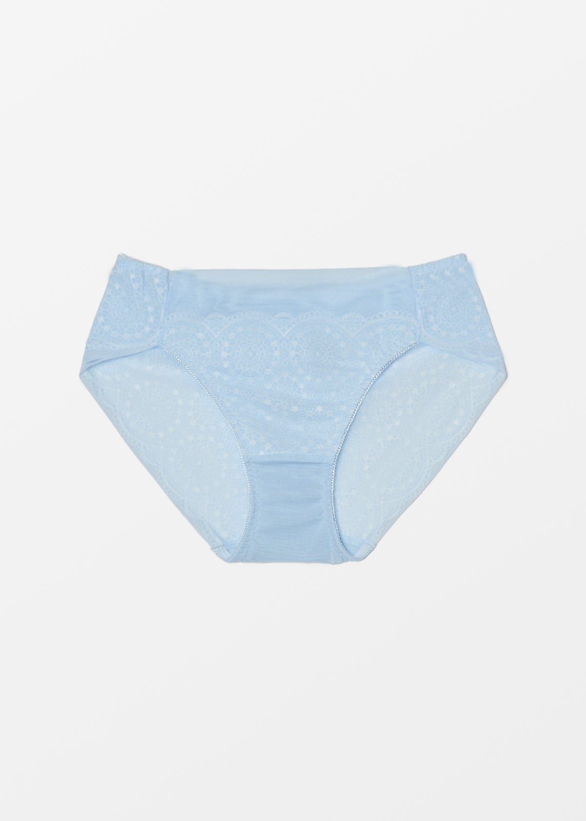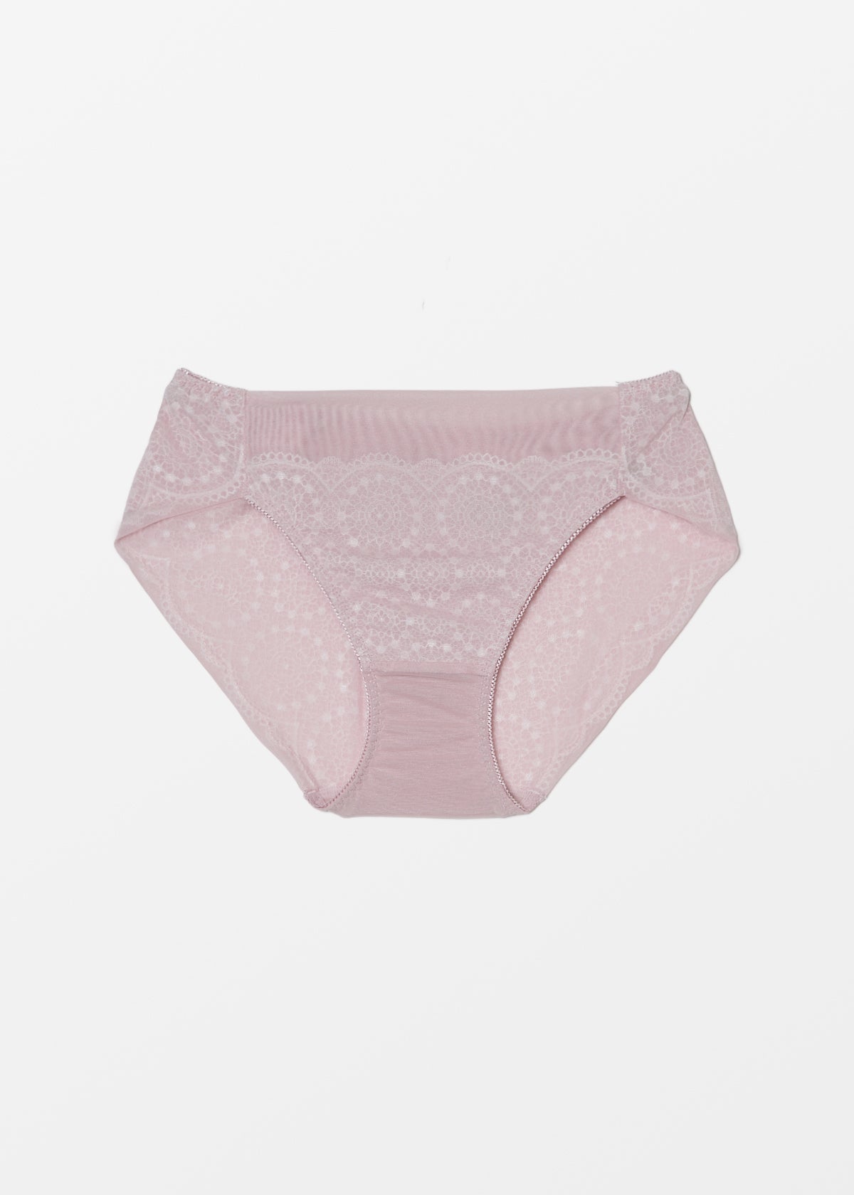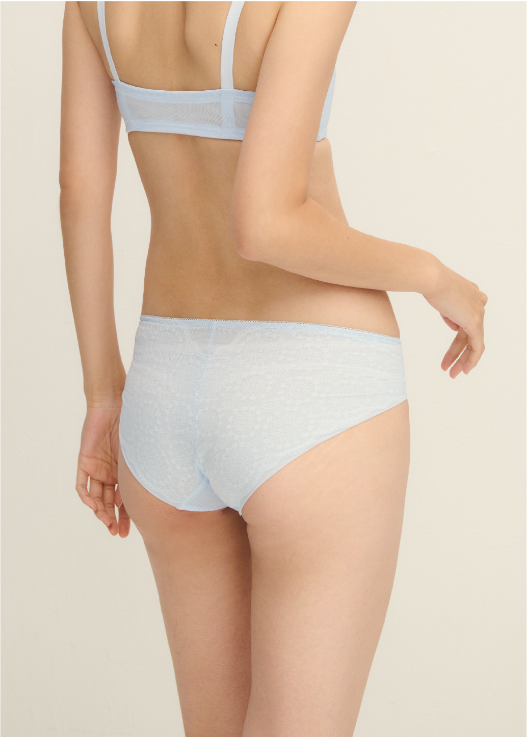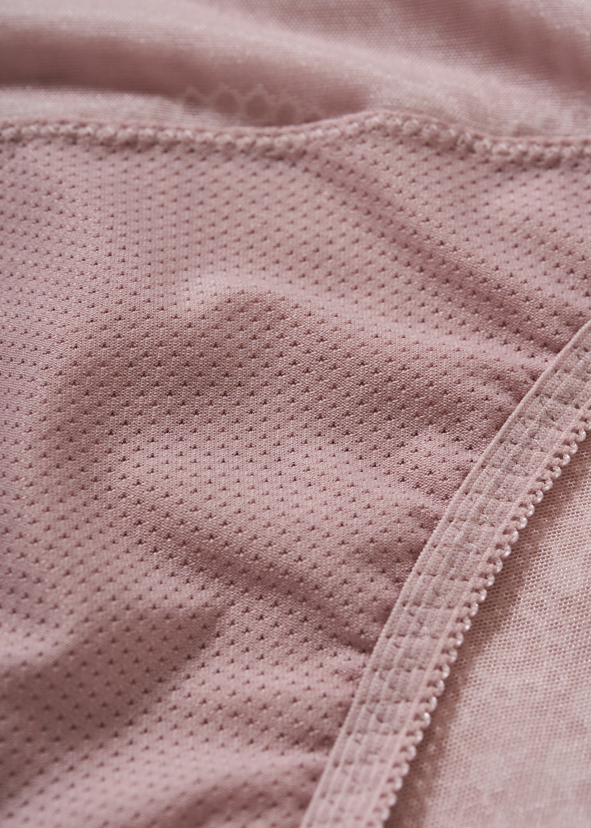 ブラ同様にレースをパワーネットの内側に挟み込み肌に直接触れず、凹凸を抑えた設計に。薄手の服やフィット感のあるボトムスでもラインが目立ちにくく、日常使いにも取り入れやすい。