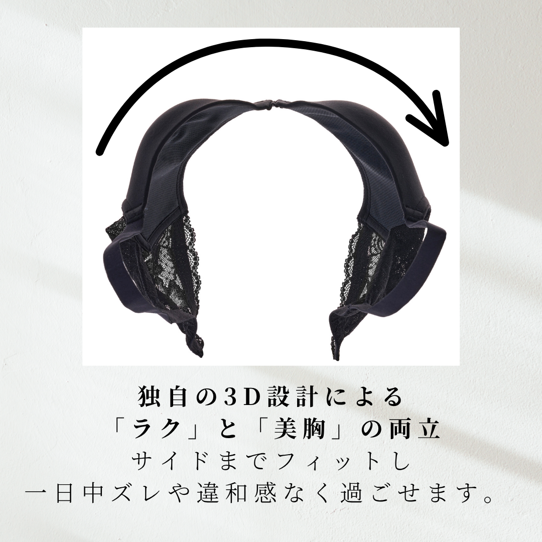 「ラクなのにキマるブラ」は、その名の通り、相反する2つの価値を同時に叶えるブラジャーです。業界初の特許取得「3D立体成型カップ」が、従来不可能とされていた「ノンワイヤーの快適さ」と「ワイヤー級の美胸シルエット」を実現。窮屈さと無縁の着け心地と、美しいバストラインという"どちらも手に入れたい"女性の願いにお応えします。