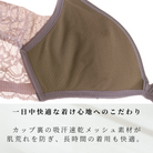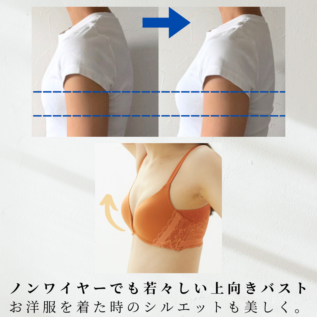 カップトップの位置を高く設定することで、ノンワイヤーでも若々しい上向きバストラインを実現。年齢とともに気になる「垂れ」にも自然と対応し、着るだけで若々しい印象に。お洋服を着た時のシルエットも美しく決まります。