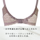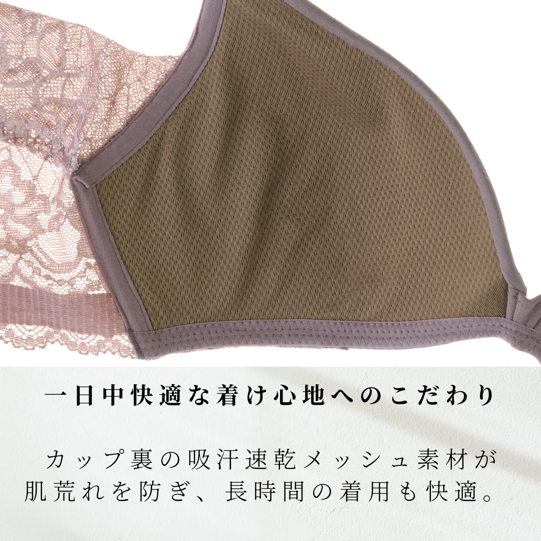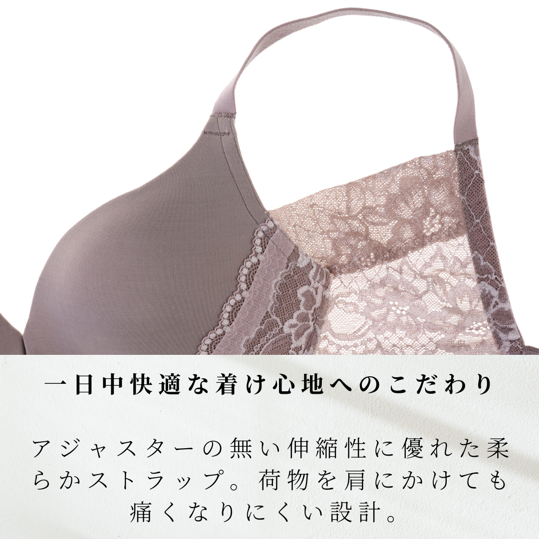 忙しい毎日に寄り添う快適さを追求しました。カップ裏には吸汗速乾メッシュ素材を採用し、さわやかな肌触りをキープ。肌荒れを防ぎ、長時間の着用も快適です。アジャスターをなくし、伸縮性に優れた柔らかストラップを使用することで、リュックやバッグを肩にかけても痛くなりにくい設計に。肩への負担を軽減し、肩コリに悩む方にも優しい設計です。