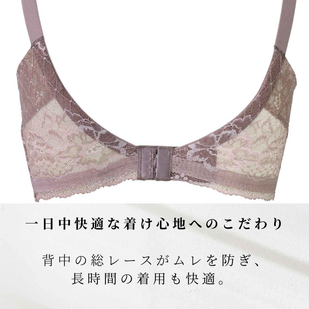 女性のカラダは年齢やホルモンバランスで日々変化します。このブラは、月経周期や妊娠初期、授乳期、卒乳期など、バストの微妙な変化にもしなやかにフィットする設計。サイドまでの立体設計によってフィット感が持続するため、一日中ズレや違和感なく過ごせます。